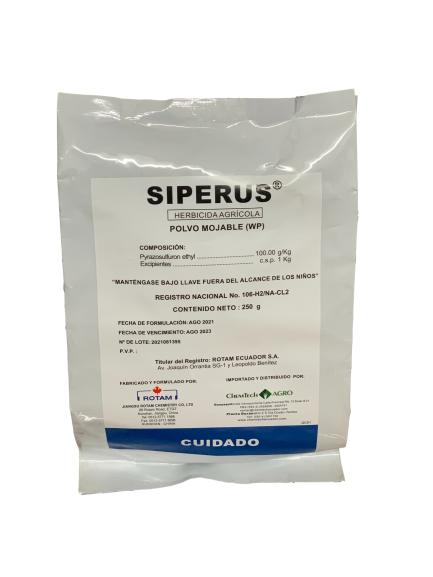 Herbicida pre-post emergente sistémico totalmente selectivo al cultivo de arroz. Controla malezas de hoja ancha, ciperáceas, commelinas y algunas gramíneas. SIPERUS actúa inhibiendo la biosíntesis de los aminoácidos esenciales valina e isoleucina, por lo tanto, deteniendo la división celular y el crecimiento de las plantas.